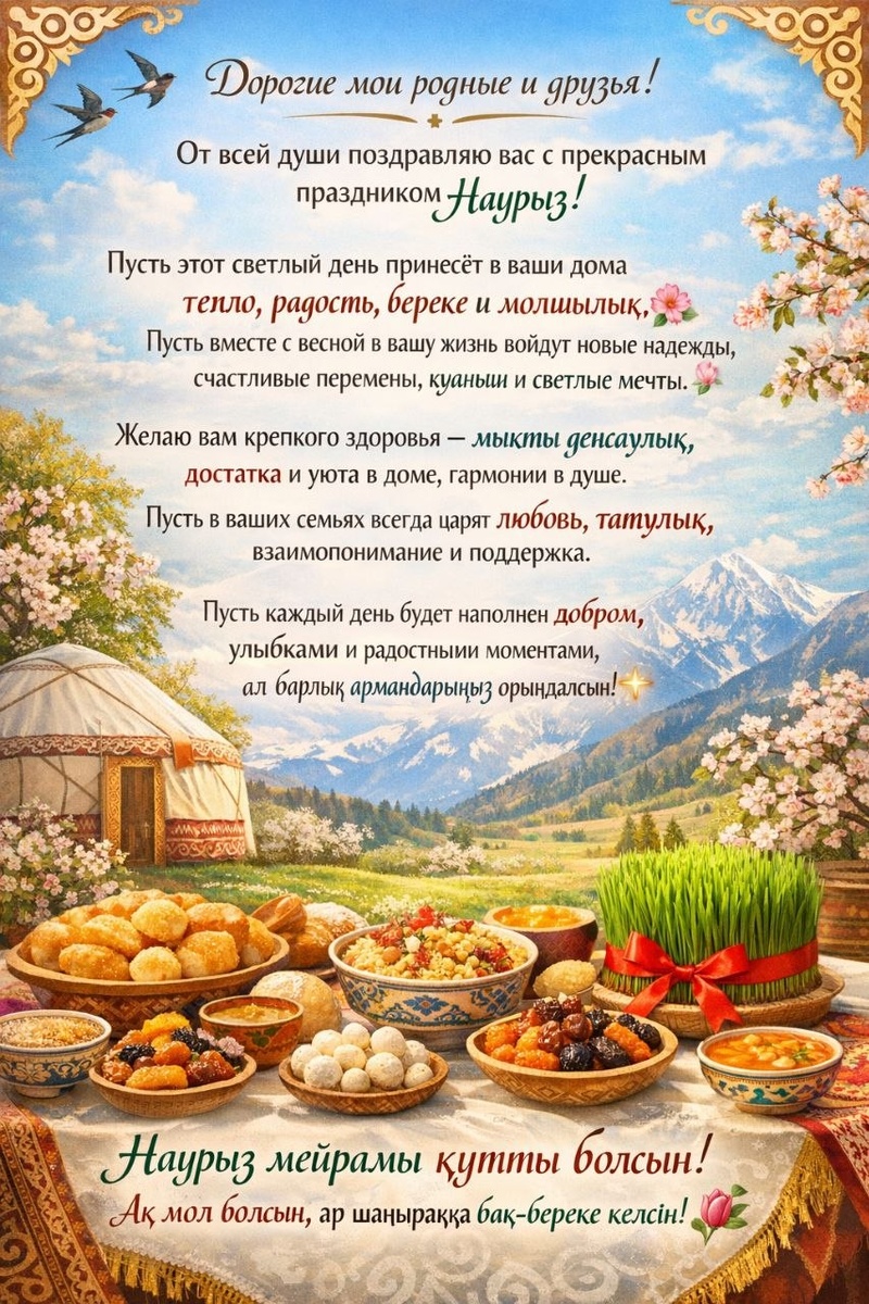 💐* 🙌Көктем сіздерге жаңару, қуаныш пен жеңілдік әкелсін Береке, үйлесім және жаңа мүмкіндіктер тілейміз ✨ ____ *💐 С праздником Наурыз 💐* 🙌Пусть этот весенний день принесёт обновление, лёгкость и радость Желаем благополучия, гармонии и процветания ✨ Ваш ГИД ПУТЕШЕСТВИЙ 💚