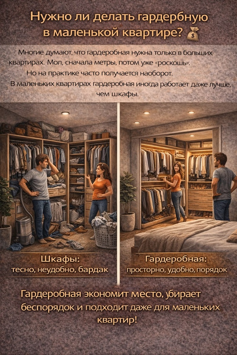 ? 👕 Многие думают, что гардеробная нужна только в больших квартирах. Мол, сначала метры, потом уже «роскошь». Но на практике часто получается наоборот. В маленьких квартирах гардеробная иногда работает даже лучше, чем шкафы. Вот почему. ▪️ Меньше шкафов по квартире Когда хранение собрано в одном месте, комнаты выглядят чище и просторнее. ▪️ Удобнее хранение Полки, штанги, корзины. Всё видно и всё на своих местах. ▪️ Экономия пространства Один продуманный гардероб может заменить 2–3 шкафа в разных комнатах. Но есть важный момент. Если площадь квартиры небольшая, гардеробная должна быть очень грамотно спланирована, иначе она просто «съест» полезное пространство. Иногда лучше сделать большой встроенный шкаф, чем маленькую неудобную гардеробную. Поэтому главный вопрос всегда один: как вы реально будете пользоваться хранением. А у вас что в квартире? 1️⃣ гардеробная 2️⃣ шкафы 3️⃣ планируем ремонт Напишите цифру в комментариях. Желаете качественный ремонт с первого раза? Напишите в личные с