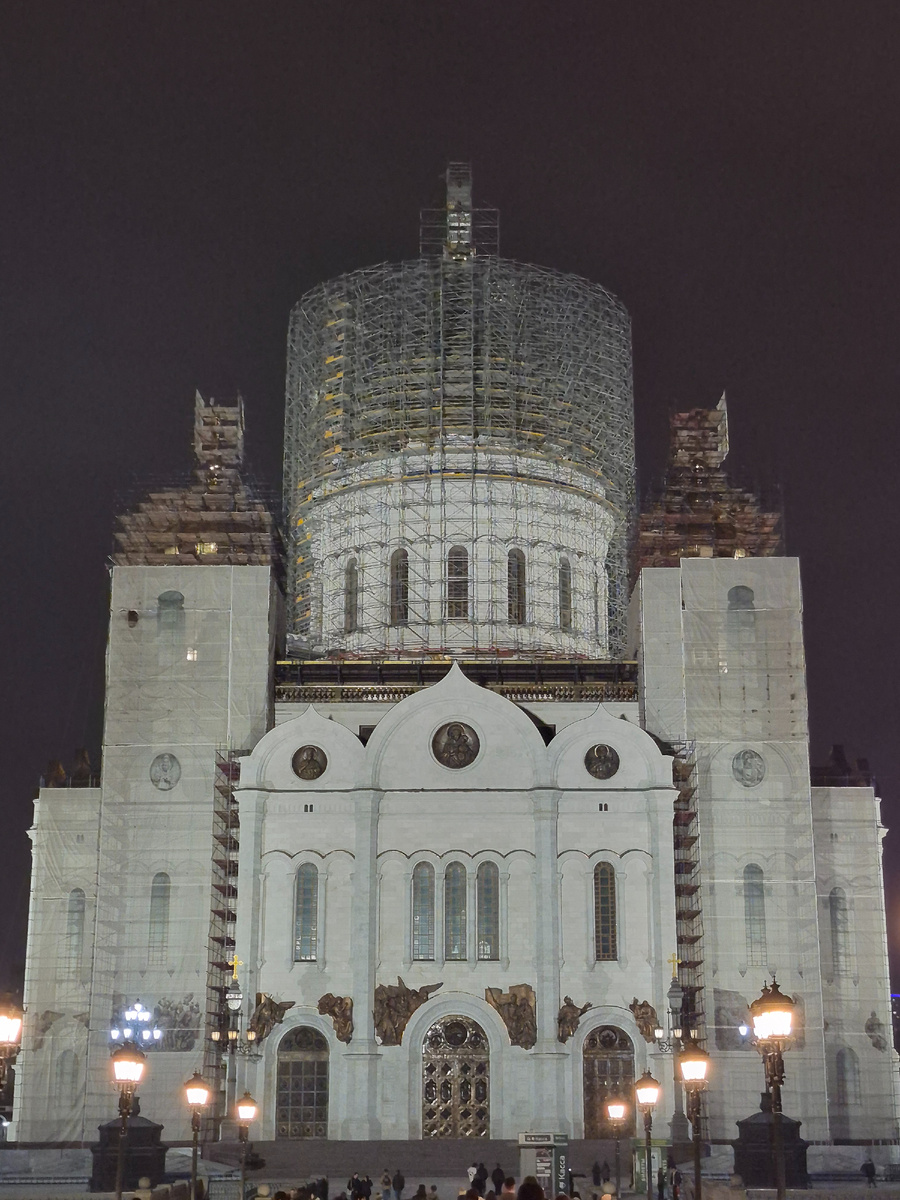 Гуляя по ночной Москве, мы невольно замедлили шаг — перед нами открылся вид на Храм Христа Спасителя. Городские огни мягко подсвечивали белоснежные стены, а купол, увенчанный золотым крестом, словно парил в тёмном небе, отражая отблески ночного освещения. Их было видно через конструкции с помощью которых храм реставрируют.
