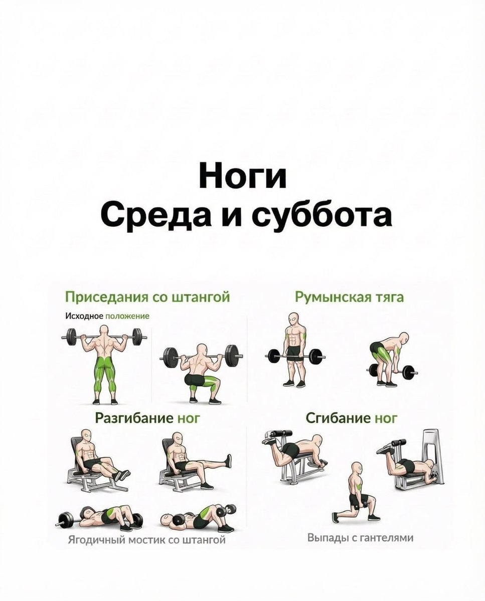 Основа — приседания со штангой и румынская тяга. Эти два упражнения дают мощный гормональный отклик и прорабатывают всю заднюю и переднюю цепь мышц.
