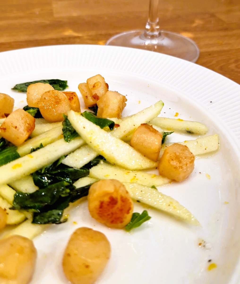 Простой и легкий освежающий салат по этому рецепту подойдет так же к другим морепродуктам. Яблоко нарезается нарезкой жульен - тонкая соломка, размером примерно со спичку. Для этого его нужно подготовить: почистить, удалить сердцевину и разрезать на четвертинки. Затем нарезаем пластинками и шинкуем тонкой соломкой. Приятного аппетита!