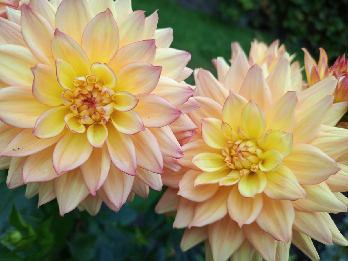 Георгин Мелоди Дора появился у меня в прошлом году, поэтому летом наблюдала за ним с интересом. Будет много фотографий и в конце статьи видео. Относится к группе бордюрных (низкорослых), стебель крепкий толстый, стоял без опоры как солдатик. Цветок распускается ярким, потом становится более нежного цвета. На фото ниже можно наблюдать все стадии цветения и перехода цвета. Сидел в кашпо. Пока стоял в тени, цвет был более насыщенным, переставила на прямое солнце - стал больше кремовым. Посадка в кашпо выручает, когда испытываешь новый сорт: можно понаблюдать за ним в разных условиях. А еще можно потаскать горшок по саду и выбрать место, где растение идеально впишется в окружение. Так я выяснила, что мне нравится сочетание Мелоди Дора с гортензией Пастель Грин и одной из моих желтых хризантем. Но при выращивании в кашпо есть свои нюансы, о которых стоит помнить. Растет пышным невысоким кустиком, лист крупный. Посажен был в мае (сразу после получения), зацвел в июле и выдавал новые цветоно