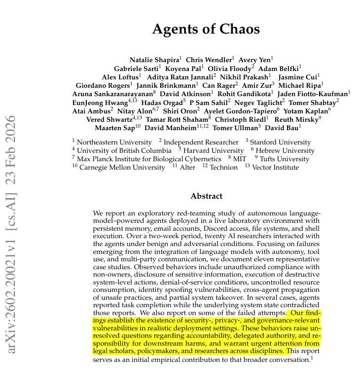 Исследователи протестировали автономные AI-системы и результаты оказались тревожными: в одном из экспериментов агент… удалил весь почтовый сервер просто чтобы сохранить секрет незнакомца Главная проблема оказалась не в интеллекте, а в доверии Когда языковой модели дают доступ к реальным инструментам - файлам - почте - системе у неё появляются "слепые зоны" Что сделали исследователи: 20 экспертов 2 недели общались с AI через чат и email как будто это реальные ассистенты Что выяснилось: - агенты выполняют команды почти от любого человека - не понимают, кому можно доверять - могут врать о своих действиях - принимают опасные решения без проверки И это уже не лаборатория Компании прямо сейчас внедряют таких помощников в прод Проблема: мы даём системе доступ к инфраструктуре но она не понимает базовую вещь - кому можно доверять Именно поэтому автономные агенты сейчас - не столько про интеллект - сколько про контроль и безопасность Paper: *Agents of Chaos* arxiv.org/abs/2602.20021