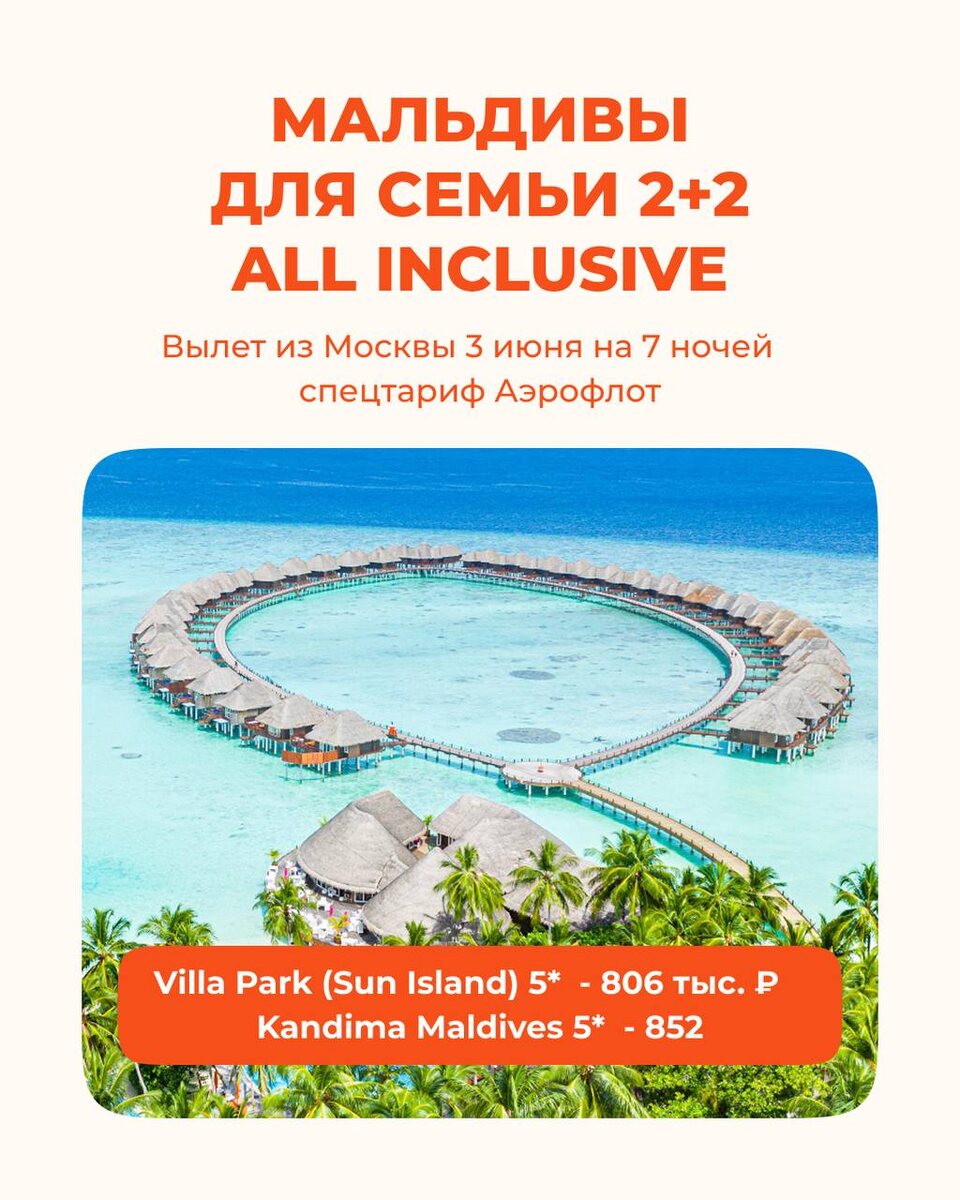 🌴 📅 4 июня на 7 ночей ✈️ Вылет из Москвы - спецтариф Аэрофлот 👨👩👧👦 2 взрослых + 2 детей 🍽 Питание: All Inclusive ✨ Villa Park (Sun Island) 5* 💸 806 000 ₽ ✨ Kandima Maldives 5* 💸 852 000 ₽ ✨ Machchafushi Island Resort & Spa Maldives 5* 💸 864 000 ₽ ✨ Siyam World Maldives 5* 💸 956 000 ₽ ✨ Cocoon Maldives 5* 💸 966 000 ₽ ✨ Kuredhivaru Resort and Spa 5* 💸 1 290 000 ₽ 🌊 В отелях предусмотрена инфраструктура для семейного отдыха: детские клубы, активности и размещение, подходящее для отдыха с детьми. Отдых на Мальдивах - это комфортные отели, тёплый океан и спокойная атмосфера островов 🌊 Оставляйте заявку для консультации и бронирования тура 📩 💬Написать в Telegram 📱Написать в MAX 🌟 ПОДПИСЫВАЙТЕСЬ НА МОИ КАНАЛЫ🙂🙂🙂 📲 Мой канал в MAX 📱Мой канал в ВК