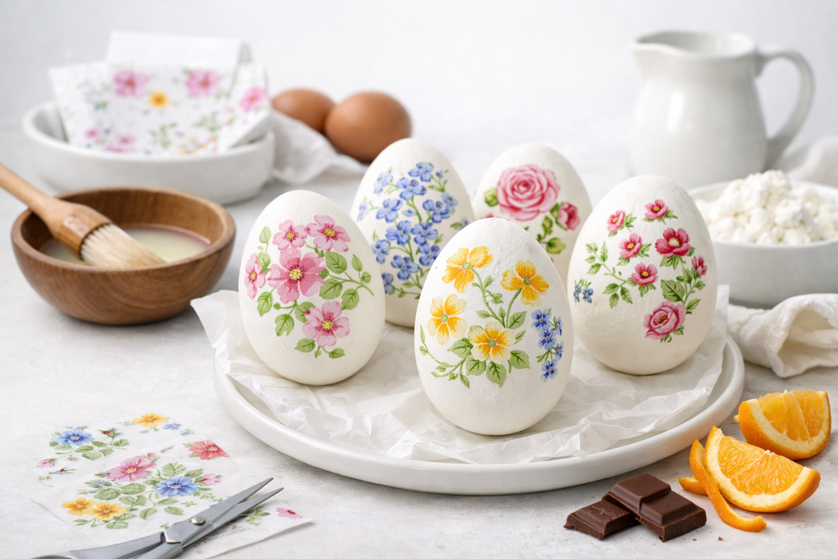 Есть пасхальный декор, на который не хочется тратить ни деньги, ни полдня. Я чаще всего беру самые обычные белые яйца, красивую бумажную салфетку и белок. Всё. Без термонаклеек, без липких рук, без пёстрых красителей, от которых потом устают глаза.