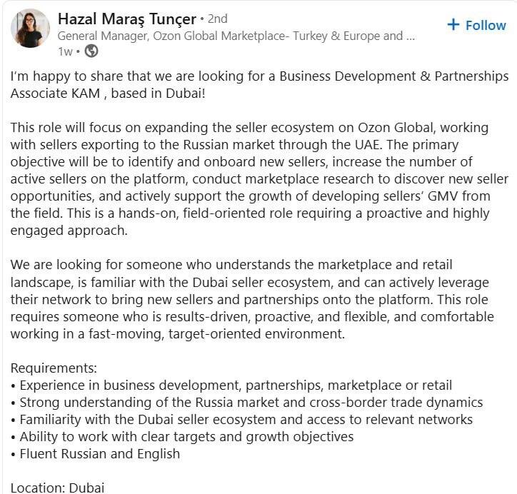 Появился показательный сигнал: Ozon Global начал искать человека в Дубае под развитие партнёрств и подключение новых продавцов. Задача максимально прикладная — находить селлеров в ОАЭ, заводить их на площадку и раскачивать поставки в Россию. Это не точечная история, а попытка системно выстроить новый поток товаров. Требования к кандидату тоже многое говорят: нужен человек, который понимает российский рынок, разбирается в кроссбордере и уже встроен в локальное сообщество продавцов в Эмиратах. Плюс свободный русский и английский. По сути, Ozon расширяет географию: если раньше основной фокус был на Китае, то теперь явно идёт движение в сторону MENA и конкретно ОАЭ. Интересно будет посмотреть на условия для этих продавцов. Если они окажутся сопоставимы с китайскими, это может заметно поменять расклад по ассортименту и ценам внутри площадки. Если у вас плохо прогружаются файлы, все посты также доступны в MAX: https://max.ru/marketplace_biz