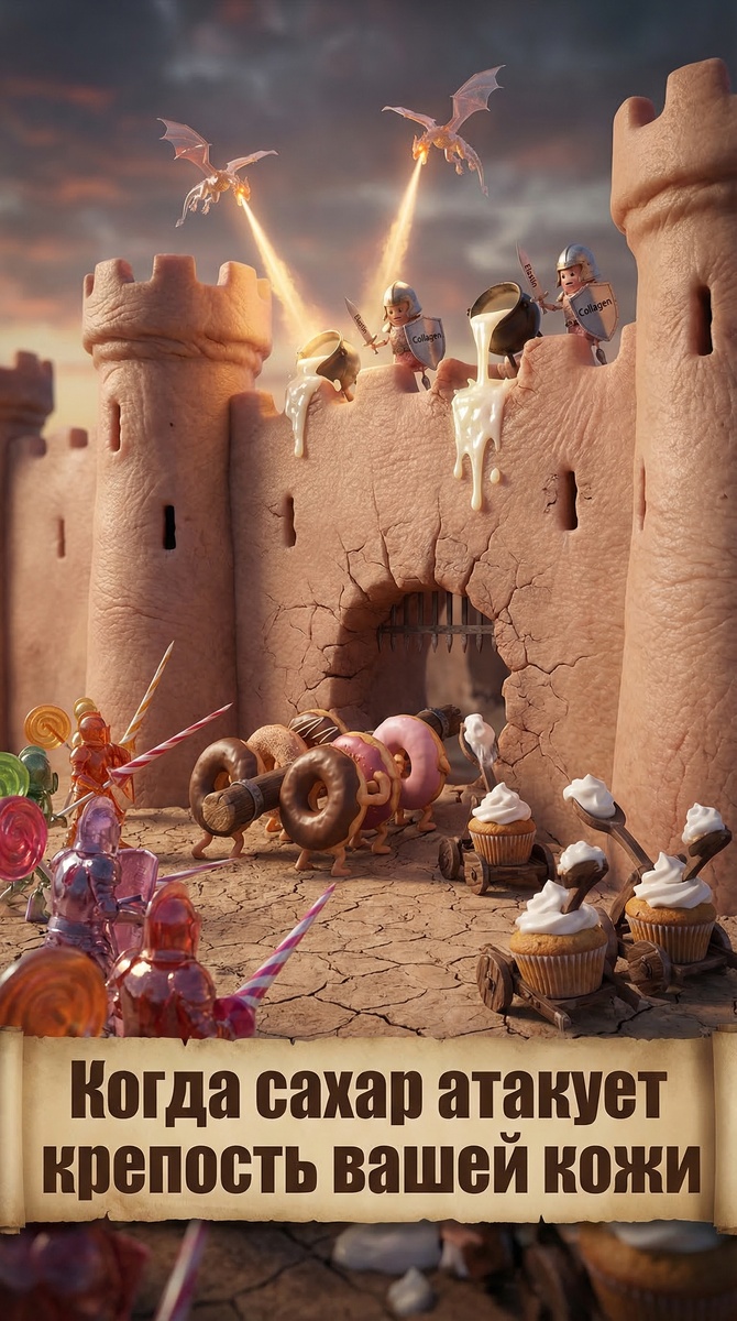 Представь, что твоя кожа — средневековая крепость. Коллагеновые стены, увлажняющие факторы внутри, SPF-щиты на страже. А снаружи — армия САХАРА. Катапульты стреляют карамелью, драконы УФ-лучей жгут стены. Если сахара слишком много — стены покрываются липкой карамельной коркой, трескаются, теряют упругость. Вуаля — морщины раньше времени. Что делать? — Меньше сахара (не корми вражескую армию) — SPF каждый день (щиты выше!) — Увлажнение (чтоб стены не сохли) А у твоей крепости сегодня осада или перемирие? 👇