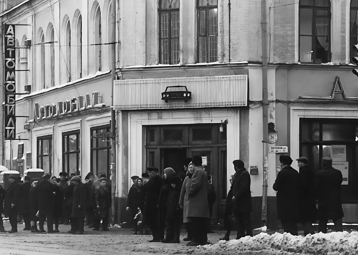Сегодня автосалоны не редкость в отличие от Москвы 1948 года, когда на весь город была одна точка продажи легковых машин. Магазин стоял на Бакунинской улице, дом 21. Название - без фантазии: "Автомобили". В торговом зале за натянутой лентой красовались три образца: "Москвич-400", "Победа" ГАЗ-20 и представительский ГАЗ-12 ЗИМ. Народ валил с утра до вечера - поглазеть. Покупателей среди этой толпы можно было пересчитать по пальцам. И понятно, почему. "Москвич-400" обходился в 8 000 руб. Средняя зарплата на заводе - рублей 800. За "Победу" просили 16 000. А ЗИМ оценили в 40 000 руб. - колоссальная сумма для обычного человека. Поэтому на старте никаких очередей не было. Хочешь "Москвич" - плати в сберкассе, забирай со склада во дворе и езжай оформлять номера. Всё. Александр Ширвиндт, тогда ещё молодой актёр, захаживал на Бакунинскую как в бесплатный театр. Стоял и гадал: бывают ли вообще люди, способные вот так взять и выложить 40 000 руб за ЗИМ? Ответ пришёл наглядно - однажды со двора