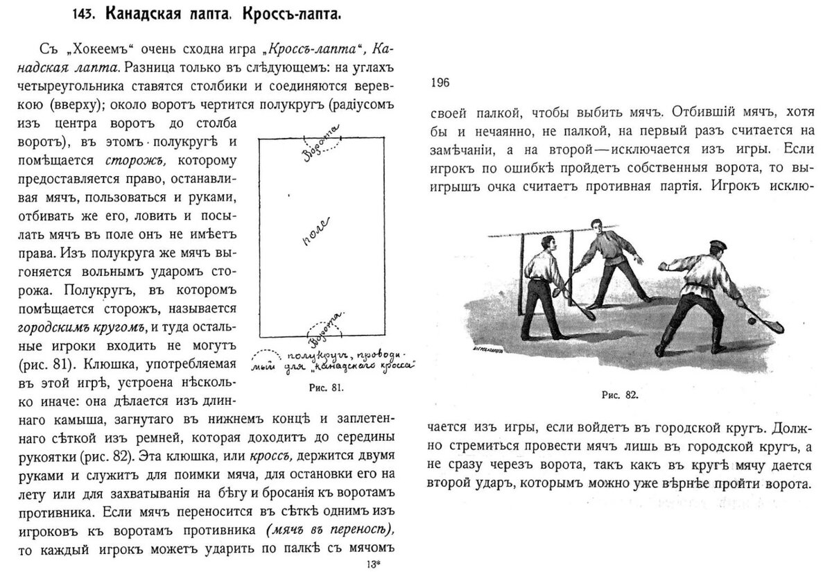 С «Хоккеем» очень сходная игра «Кросс-лапта«, Канадская лапта. Разница только в следующем: на углах четырехугольника ставятся столбики и соединяются верёвкою (вверху); около ворот чертится полукруг (радиусом из центра ворот до столба ворот), в этом полукруге и помещается сторож, которому предоставляется право, останавливая мяч, пользоваться и руками, отбивать же его, ловить и посылать мяч в поле он не имеет права. Из полукруга же мяч выгоняется вольным ударом сторожа. Полукруг, в котором помещается сторож, называется городским кругом, и туда остальные игроки входить не могут (рис. 81).