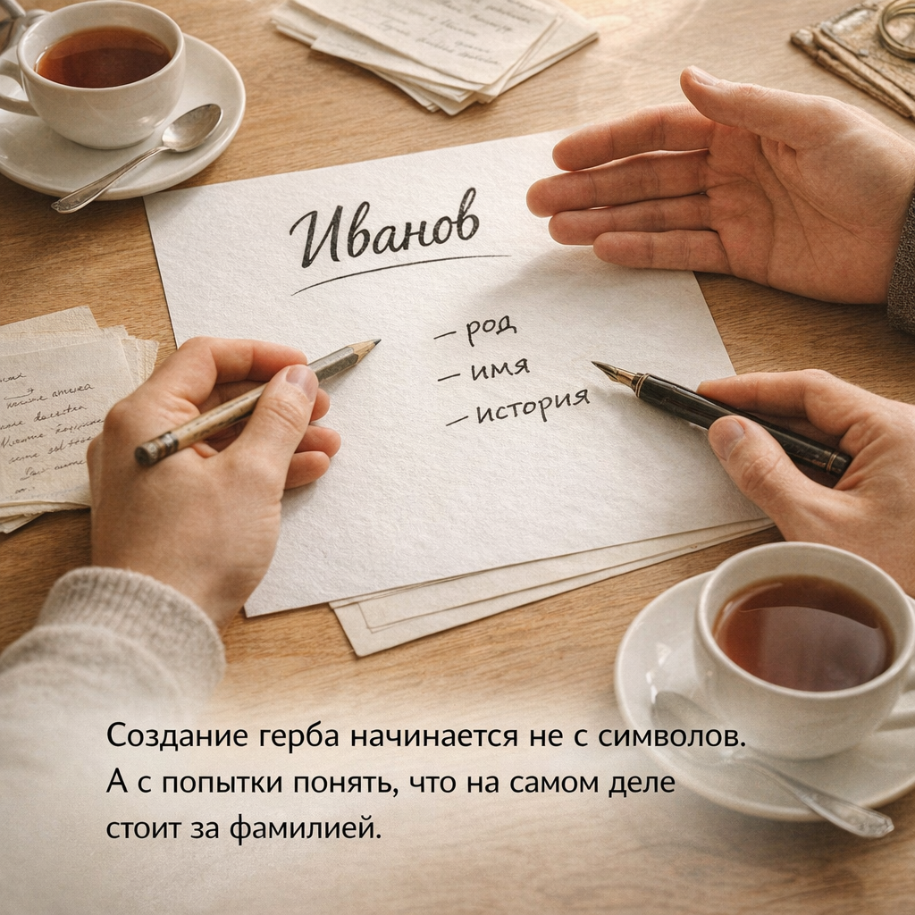 С разговора. С попытки понять, что именно стоит за фамилией, за историей, за человеком. Фамилия, кстати, не всегда даёт готовый образ. Например, Иванов. Она не про «сокола» или «кузнеца». Но за ней есть глубина — имя, традиция, культурный слой. И если работать с этим уровнем, появляется гораздо больше с
