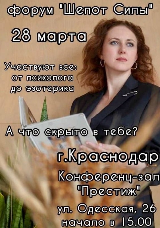 … Она сначала звучит как тихий вопрос внутри: «А если я могу больше?» 28 марта в центре Краснодара пройдёт форум «Шёпот Силы» 🕒начало в 15:00 📍Одесская, 26 Офисный комплекс "О5" Конференц-зал "Престиж" 3 этаж Это не просто про «послушать спикеров». Это про то состояние, когда ты приходишь и начинаешь слышать себя громче. Что здесь происходит на практике: 🔶ты смотришь на людей на сцене и понимаешь: «...а ведь я тоже могу» 🔶за несколько часов находишь тех, к кому реально откликается пойти 🔶ловишь идеи и мысли, которые могут развернуть твой текущий путь 🔶начинаешь видеть свои сильные стороны чуть яснее 🔶 попадаешь в среду, где нормально хотеть большего И самое интересное — каждая уходит отсюда со своим ответом. Иногда неожиданным. Для кого это: если ты в поиске, в переходе, в росте или просто чувствуешь, что внутри есть что-то большее, чем ты сейчас проявляешь. Вход для гостей — свободный (нужна только регистрация) 🔗https://t.me/steptomee 📲89180931874 Нина Иногда т