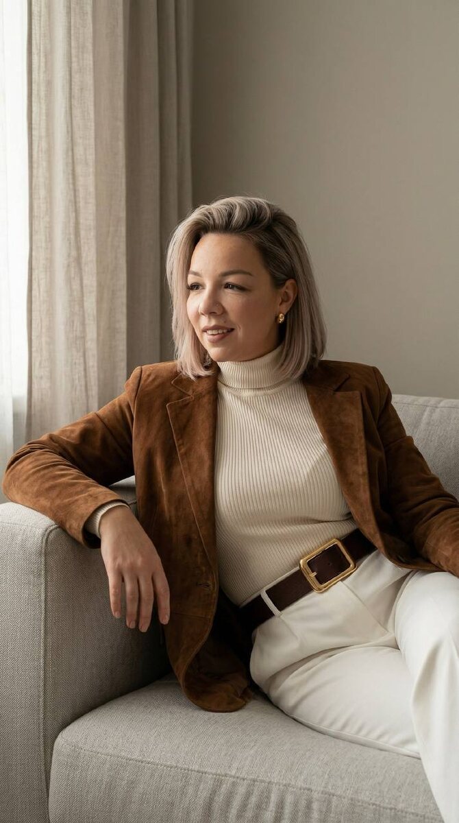1️⃣Переходим на удобный сервис для генерации: 👉 Syntx Ai 👉 Veo3 2️⃣Выбираем дизайн ИИ/создать картинку 3️⃣Nano banana pro🍌 4️⃣Загружаем свое фото и промпт 📌ВИДЕОИНСТРУКЦИЯ ПО ИСПОЛЬЗОВАНИЮ В ЗАКРЕПЛЕННЫХ СООБЩЕНИЯХ 👍👍👍👍👍👍 ⚠️ПОДПИШИСЬ НА РЕЗЕРВНЫЕ КАНАЛЫ 👇 📱 канал в ВК 📱 канал в МАХ ◾️ПРОМПТ : Элегантный fashion-кадр: женщина в расслабленной позе, полу-лежа на светло-сером диване, кадр охватывает корпус и бедра (три четверти), одета в коричневый замшевый пиджак, светлую ребристая водолазка, белые классические брюки и тёмно-коричневый кожаный ремень с крупной прямоугольной золотой пряжкой, минималистичные золотые серьги, волосы цветом как на фото, короткие, но густые, с объемом у Корней. ; минималистичный интерьер с нейтральной бежево-серой стеной и лёгкими занавесками слева; мягкий рассеянный дневной свет из окна слева, тёплые полутени, низкая контрастность, подчёркнутая текстура замши и ткани; настроение — сдержанная роскошь, спокойная утончённость, editorial