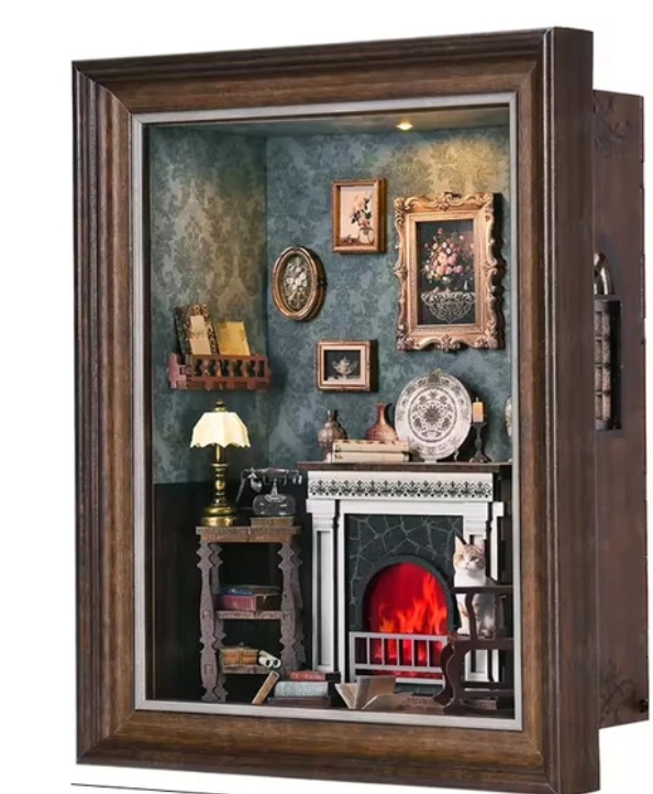Поехали! Это камин в игрушке, но он — мёртвый. Там по плану производителя просто горит диод. Я поставил медленно переливающиеся. Торшер шел без подсветки. Добавил туда диодик для красоты. Естественно, что всё должно управляться мини драйвером для LED. Начинаю сбоку. Добавив диодик к лампе монтирую. Присоединяю камин Добавляю аквариум и свечку на камин вместо грустной пустоты. Обязательно аквариум подсветил снизу, чтобы рыбку было видно. Также сбоку ввел новый элемент в виде окна. В том месте было отверстие для протяжки жирного провода для 3-х диодов. Стало культурнее. Для питания конструкции использовал литиевую батарею. Хотелось сделать всё автономно, поэтому подключе