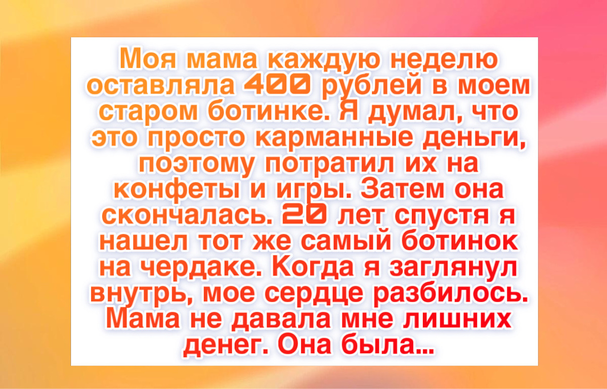 “Я вырос с ощущением, что у нас все нормально. Мама никогда не покупала себе новую одежду, носила одно и то же пальто много лет, но холодильник всегда был полный. Каждую пятницу утром я находил в своем старом ботинке около 400 рублей. Это был наш ритуал. Я был эгоистичным ребенком, ничего не спрашивал и тратил деньги на комиксы, игры и сладости. Я чувствовал себя самым счастливым ребенком, потому что у меня всегда были эти волшебные деньги. Даже когда я вырос и съехал, приезжая домой, я снова находил деньги в ботинке. Я смеялся и говорил: Мам, мне уже 25, мне не нужны карманные деньги. Она подмигивала и говорила: Это на чудеса. Потом она умерла. Спустя годы я разбирал чердак и нашел старый рабочий ботинок, а внутри толстую тетрадь и банковскую выписку с суммой, в которую я не мог поверить. Но меня сломала не выписка, а тетрадь. Это был не дневник. Это был журнал ее лечения. У мамы был тяжелый диабет, и я узнал, что она иногда специально пропускала дорогие лекарства и добавки. Она высчитывала стоимость каждой пропущенной дозы до копейки. Те деньги в моем ботинке были не лишними. Это были деньги, которые она экономила, разрушая свое здоровье. Она буквально меняла свое здоровье и в итоге свою жизнь на то, чтобы ее сын никогда не чувствовал себя бедным. В тетради лежало письмо: Я видела, как ты смотришь на детей с новыми игрушками, и не могла это выносить. Я не хотела, чтобы ты вырос с ощущением, что ты хуже других. Я хотела, чтобы ты верил, что мир полон маленьких чудес. Прости, что я ушла немного раньше. Я просто обменяла свое время на твое будущее. Иди по жизни с поднятой головой. И тогда я понял, что все эти годы тратил не карманные деньги. Я тратил жизнь своей мамы.”