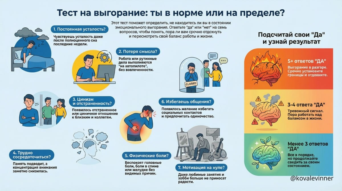 ΠΡΠΎΡ ΡΠ΅ΡΡ ΠΏΠΎΠΊΠ°ΠΆΠ΅Ρ, ΠΆΠΌΠ΅Ρ Π»ΠΈ ΡΠ΅Π±Ρ ΡΠΌΠΎΡΠΈΠΎΠ½Π°Π»ΡΠ½ΡΠΉ ΠΏΡΠ΅ΡΡ ΠΈΠ»ΠΈ Π΅ΡΠ΅ Π΄Π΅ΡΠΆΠΈΡΡΡΡ. ΠΡΠ²Π΅ΡΠ°ΠΉ Π΄Π°/Π½Π΅Ρ. 1οΈβ£ ΠΠΎΡΠ»Π΅Π΄Π½ΠΈΠ΅ Π½Π΅Π΄Π΅Π»ΠΈ ΡΡΠ²ΡΡΠ²ΡΠ΅ΡΡ ΠΏΠΎΡΡΠΎΡΠ½Π½ΡΡ ΡΡΡΠ°Π»ΠΎΡΡΡ, Π΄Π°ΠΆΠ΅ ΠΏΠΎΡΠ»Π΅ ΡΠ½Π°? 2οΈβ£ Π Π°Π±ΠΎΡΠ° ΠΈΠ»ΠΈ ΡΡΡΠΈΠ½Π° ΠΏΠΎΡΠ΅ΡΡΠ»Π° ΡΠΌΡΡΠ», Π΄Π΅Π»Π°Π΅ΡΡ Π½Π° Π°Π²ΡΠΎΠΏΠΈΠ»ΠΎΡΠ΅? 3οΈβ£ Π‘ΡΠ°Π» ΡΠΈΠ½ΠΈΡΠ½ΡΠΌ ΠΈΠ»ΠΈ ΠΎΡΡΡΡΠ°Π½Π΅Π½Π½ΡΠΌ Π² ΠΎΠ±ΡΠ΅Π½ΠΈΠΈ Ρ Π±Π»ΠΈΠ·ΠΊΠΈΠΌΠΈ? 4οΈβ£ Π’ΡΡΠ΄Π½ΠΎ ΡΠΎΡΡΠ΅Π΄ΠΎΡΠΎΡΠΈΡΡΡΡ, ΠΏΠ°ΠΌΡΡΡ ΠΏΠΎΠ΄Π²ΠΎΠ΄ΠΈΡ ΡΠ°ΡΠ΅ ΠΎΠ±ΡΡΠ½ΠΎΠ³ΠΎ? 5οΈβ£ Π€ΠΈΠ·ΠΈΡΠ΅ΡΠΊΠΈ Π±ΠΎΠ»ΠΈΡ Π³ΠΎΠ»ΠΎΠ²Π°, ΡΠΏΠΈΠ½Π° ΠΈΠ»ΠΈ ΠΆΠ΅Π»ΡΠ΄ΠΎΠΊ Π±Π΅Π· Π²ΠΈΠ΄ΠΈΠΌΡΡ