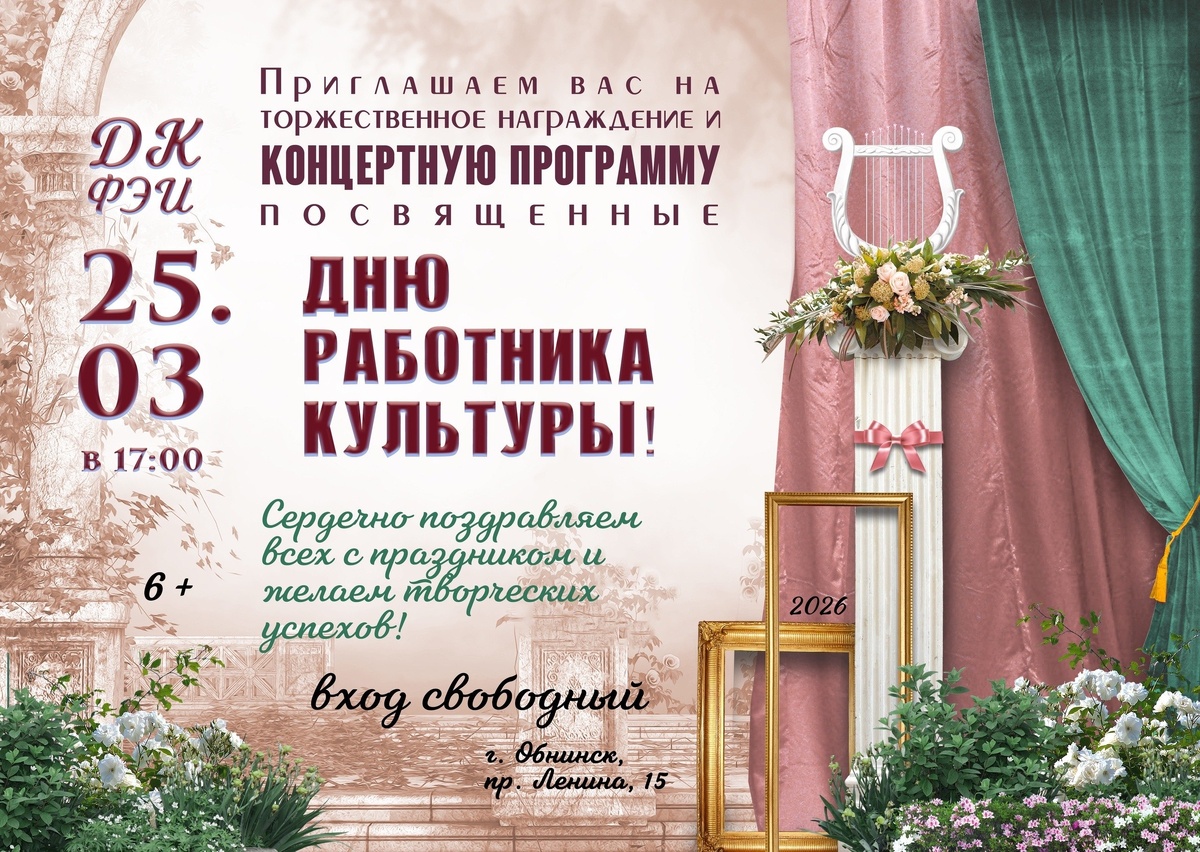 🎶 25 марта в 17:00 в ДК ФЭИ в Обнинске пройдёт торжественное награждение и концертная программа, посвящённые Дню работника культуры.