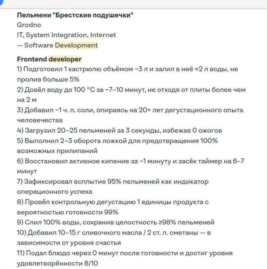 + Айтишник написал в резюме рецепт ПЕЛЬМЕНЕЙ