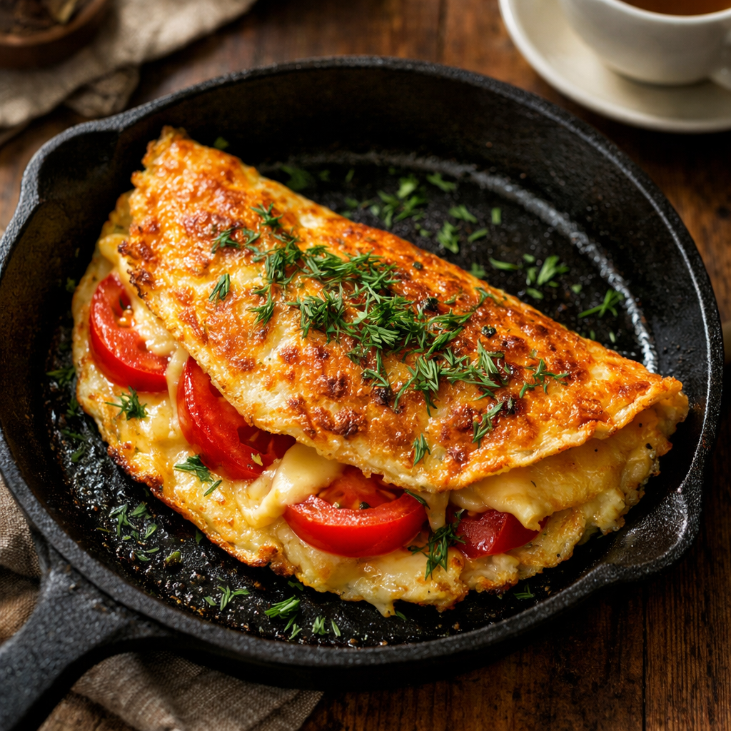 Перекладываем эту красоту со сковороды на симпатичную тарелку. Вы только представьте: снаружи у нас потрясающая, румяная, чуть похрустывающая сырная корочка, которая так аппетитно тянется за вилкой. А внутри — нежнейший, воздушный омлет, пропитанный сливочным маслом, с сочными теплыми кусочками помидора и свежим ароматом укропа.