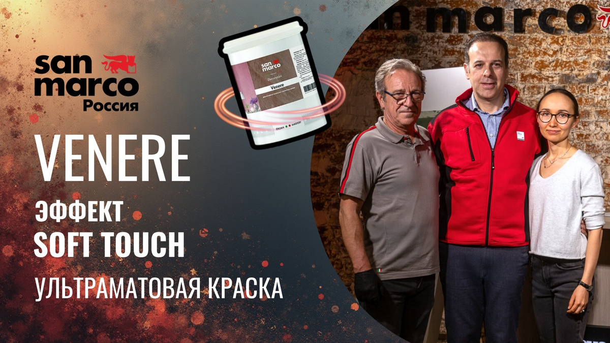 Venere — одна из самых востребованных новинок, представленных San Marco Russia в 2025 году. Это декоративная краска с экстремально матовой поверхностью и эффектом soft touch, отличающаяся бархатистой фактурой. Покрытие реагирует на движение света и прикосновение руки, создавая эффект, напоминающий замшу. Технология нанесения включает грунт глубокого проникновения, колерованный грунт Fondecor и два слоя Venere, которые наносятся специальной техникой, постепенно формируя рисунок поверхности. Продукт обладает меньшей укрывистостью по сравнению с некоторыми другими декоративными покрытиями, поэтому требует непрерывных и согласованных движений при нанесении, чтобы избежать видимых стыков. В результате получается выразительная, материальная и изысканная отделка, особенно подходящая для декоративных стен, спален, изголовья кровати и акцентных зон, тогда как для помещений с высокой нагрузкой или частыми механическими воздействиями она подходит меньше. Полная технология — грунт, два слоя Venere