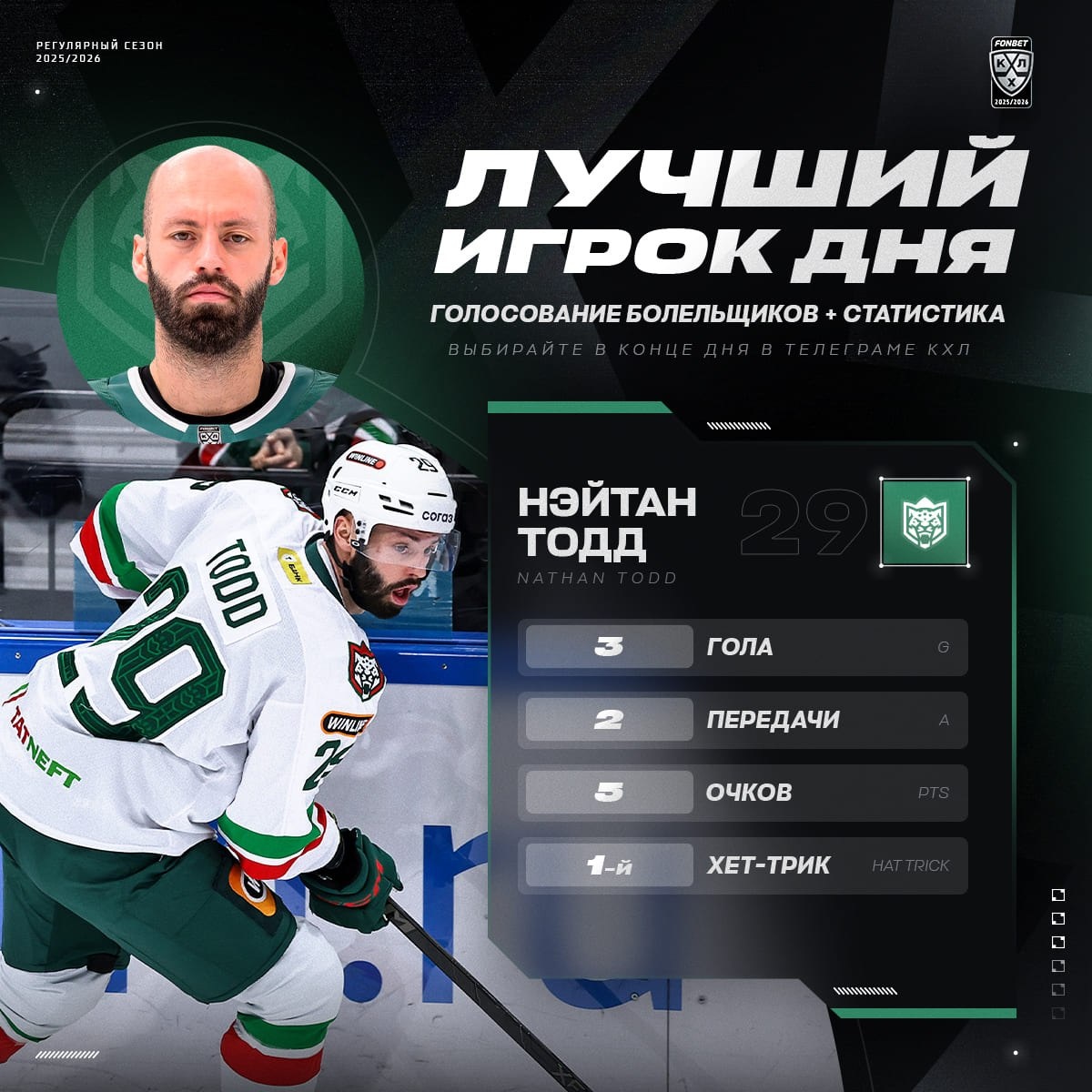 К последней игре регулярного сезона Нэйтан Тодд 🟢 подготовил что-то особенное: хет-трик и пять очков — его лучшая игра в КХЛ!