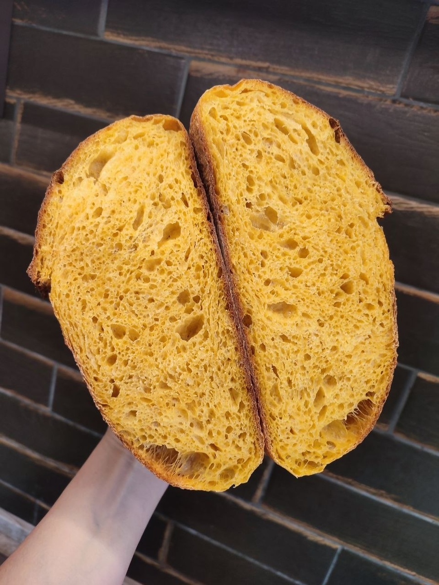 😉 Я вообще редко делаю хлеб одинаково и по рецепту. Всегда вношу изменения. В этот раз вышло так: хотела делать на 1 кг муки, но в процессе передумала. Решила,что много. И в итоге на 350 г тыквенного пюре, 360 г воды добавила 700 г муки и 200 г закваски. Понятно, что увеличенная норма закваски тоже сыграла свою роль в ускоренном брожении теста. Но речь не об этом, а об увеличенной нагрузке на муку: много воды и очень много тыквы! Как показал результат, - и так можно! Помните: "нам всё ЛЬЗЯ!" Принцип позаимствован у Татьяны Мужицкой, но думаю, она не будет против😍