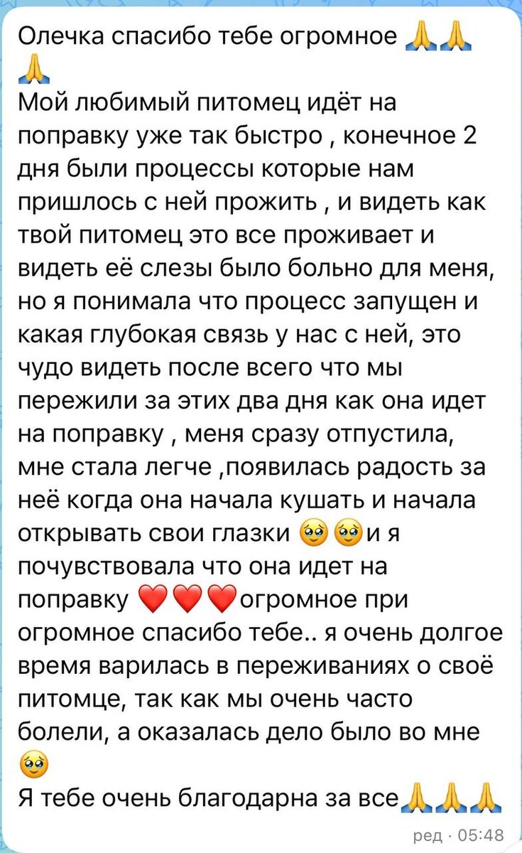 💞 Кошечка пошла на поправку. И причина была в убеждениях хозяйки, которые мы обнаружили и убрали на сессии 🫶🏻 Пусть ваши любимые питомцы будут здоровыми и радуют вас своим беззаботным присутствием в вашей жизни! 🐈⬛💚