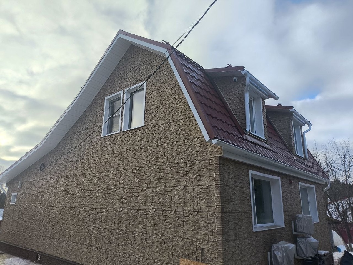При сильных теплопотерях и неправильном «кровельном пироге» появляется конденсат — он приводит к протечкам и намоканию наружных стен, даже если само покрытие не протекает при дожде. Почему так происходит: отсутствие или недостаток утепления и/или нарушена последовательность слоёв кровельного пирога (парозащита — утеплитель — вентзазор — обрешетка — покрытие). - Симптомы: наледь/сосульки на свесах, тёплые снежные «пятна», капли и пятна влаги на стенах изнутри и снаружи. - Надёжный способ устранить проблему: полный демонтаж кровельного покрытия и переделка пирога по нормам и правилам. Иногда кровельное покрытие удаётся сохранить, но чаще — нет (изменяют размеры скатов или покрытие было смонтировано неправильно). Что сделали на этом доме (пример на фото) - Проблема: отсутствие утепления и неправильный пирог → наледь, протечки; старое покрытие сохранить нельзя. - Решение: утепление кровли 200 мм, замена металлочерепицы на Grand Line Kvinta plus (RAL 3009), установка снегозадержателей и