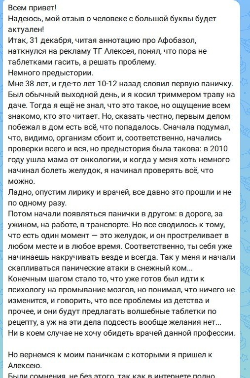 Без страха за каждую секунду. - Первый раз накрыло примерно лет двенадцать назад. - Где произошло? Кто-то был рядом? - На даче косил триммером и вдруг почувствовал себя странно. - Странно это как? - Волнение поднялось, сердцебиение, потрясывать начло, жар во всём теле. - Что уже делали чтоб решить проблему? - Ходил по врачам, делал обследования, сдавал кровь. Панички при этом накапливались снежным комом. В дороге накрыло, за ужином, на работе, теперь вообще везде стало. - Что хотите получить от нашей работы? - Я хочу одного, просто перестать жить в режиме а вдруг накроет и мне никто не успеет помочь. Перестать проверять пульс, нащупывать сердце, искать врачей, которые всё равно ничего не найдут. Забыть, где лежит тонометр и паники длительностью по несколько часов. Не минут как у всех, а этих бесконечных часов. Просто… жить. Без паники. Без страха за каждую секунду. - Я должен ещё что-то знать? - Честно говоря у меня сомнения. - Знаете в чём основная сложность в работе с паническими