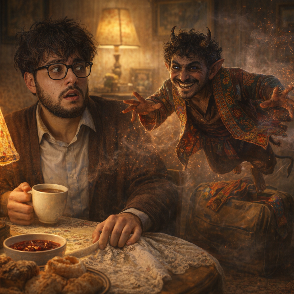 — Хорошо, я сейчас уже ко всему привык. А тогда… Боже, ты только представь картину. Вся семья за столом, улыбки до ушей, чай пьём, варенье едим. Тётя Гоар уже третий раз предлагает добавку, мама счастлива, бабушка довольна. А я один сижу бледный как полотно и вижу, как из её дорожной сумки выползает это… это Алышкер. Такой джинн-хулиган, пакостник низшего ранга.