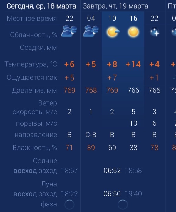 Сегодня, 19 марта, астраханцев ждет приятная солнечная погода. Без осадков. Утром температура в городе составит +8 градусов. Днем потеплеет до +14. К вечеру температура вновь упадет до +4 градусов. Астраханцев ждет восточный ветер со скоростью 5 ‑10 м/с. Атмосферное давление составит 766 мм рт. ст. Влажность воздуха в пределах нормы. На территории всего региона будет восточный ветер со скоростью 5 ‑12 м/с. Температура воздуха ночью опустится до +5 градусов, а днем повысится до +16. Погодные приметы: Сообщение Сегодня в Астрахани будет солнечно появились сначала на Астрахань.Ру последние новости региона.