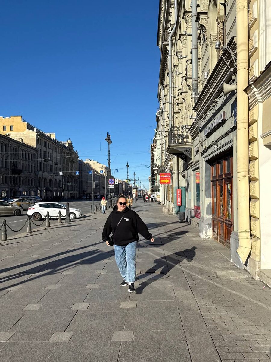 Выгуливаю свой худи «Живу в Саратове, люблю…» и обвес на сумку с назуком по Невскому проспекту.