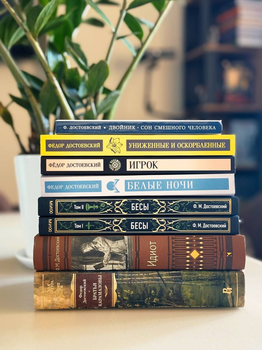 Моя скромная, но такая разнообразная коллекция книг Достоевского! В этом году стараюсь читать по книге ФМ каждый месяц — получился