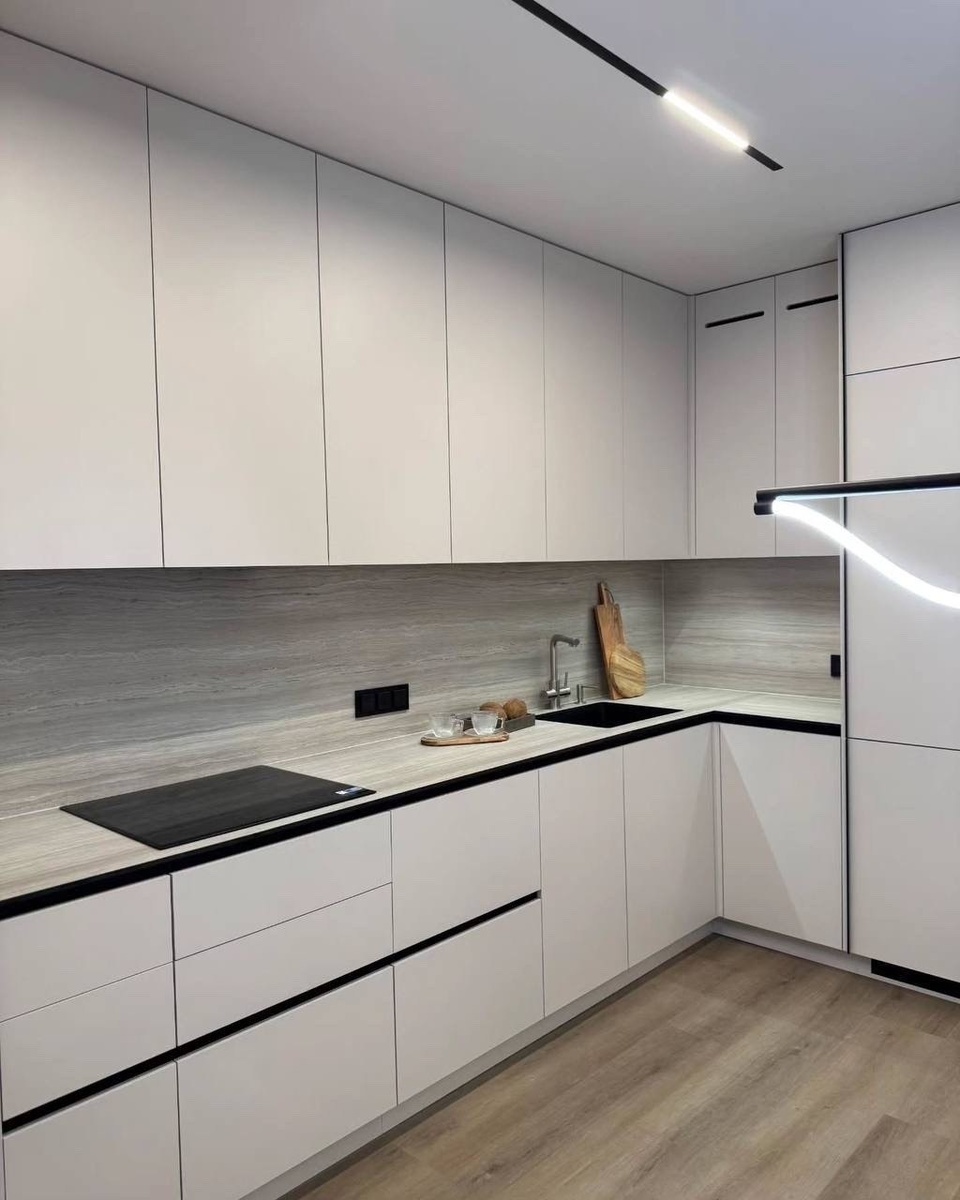 😍 Верхние и нижние фасады выполнены в одном оттенке, без ручек и декоративных элементов. За счет этого пространство выглядит цельным и легким, а кухня хорошо вписывается в современный интерьер. Столешница и стеновая панель выполнены под светлое дерево. Подсветка сверху делает кухню более выразительной и удобной в использовании✔️ Установлена столешница из компакт плиты Тик белогорский дымчатый✅ Фасады выполнены из МДФ в ПВХ плёнке Керамик ✅ Установлена скрытая система ручек "Гола"✅ Мойка подстольного монтажа ✅ 350000руб💰 *стоимость действительна на момент установки и без учёта техники Хотите узнать стоимость Вашей будущей мебели💸 или записаться на замер🤳🏻 Пишите или звоните➡️ +79144009060 (Telegram, Max) А так же,присылайте примерные размеры или проект👉🏻СЮДА👈🏻 и менеджер сделает для Вас предварительный расчёт вашей кухни🔥