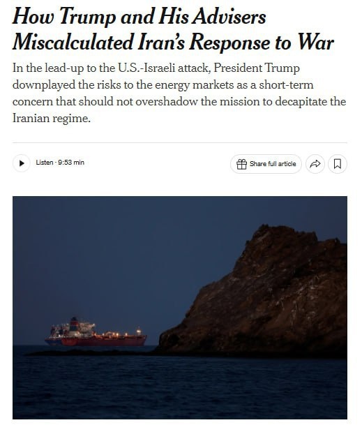 ! 😄 По информации The New York Times, несмотря на предостережения своих советников, Белый дом был уверен, что молниеносные удары по Ирану и его ключевым лидерам приведут к немедленной смене власти. Ну, кто бы мог подумать, что это не сработает? И, как будто этого было недостаточно, администрация США не учла, что Иран может ограничить судоходство через Ормузский пролив. Вот это поворот! Кажется, в Вашингтоне не все так просто, как им хотелось бы!