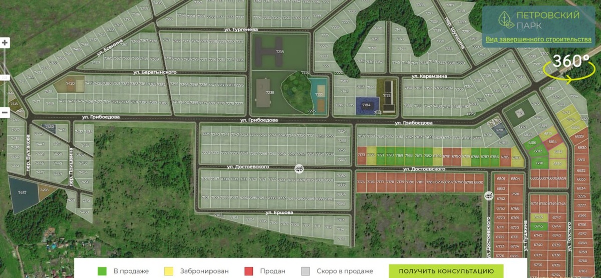 Поселок "Петровский парк". Я мало рассказываю про наши большие проекты, это один из них. Старт продаж был чуть меньше года назад, объём проданных участков можно увидеть на карте, они закрашены красным. Первая очередь участков уже распродана на 95%, открыли вторую очередь продаж и дорисовали полностью карту поселка. На старте проекта в него входили внешние инвесторы, помимо основного, и они уже успешно вышли, заработав свои десятки процентов доходности многократно превышающие банковские вклады. Зашли в проект застройщики, и мы успешно продаем их дома, каркасные, сибитные(газобетон), кирпичные, теплостен, брусовые. Стилистика поселка выдерживается за счет обязательства о сохранении единого стиля, которое подписывает каждый из покупателей. Мы создаем красивое место, куда будет приятно приезжать. Уже получены технические условия на газ, подведено электричество с заводом на участок подземным способом. Готовится документация на центральный водопровод.(трубы уже проложены по магистральн