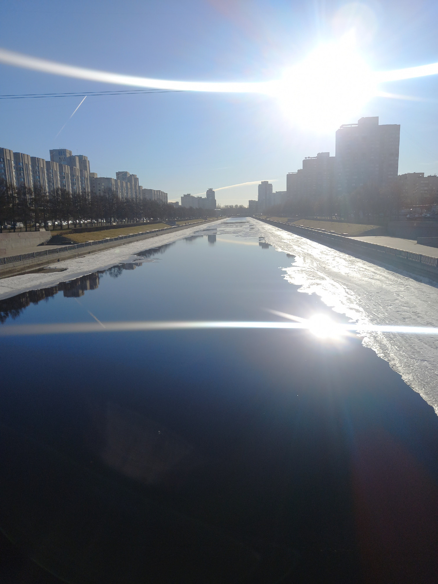 И льда здесь на реке Смоленке еще много.Значит вывод-в центре намного теплее,там у огромной Невы ни одной льдинки уже нет.