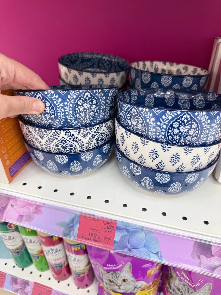 На входе меня сразу встретила яркая посуда. Честно говоря, она на любителя: очень пёстрая, с сочными акцентами. Мне почему-то сразу вспомнилась восточная тематика — такие насыщенные узоры часто встречаются в интерьерах с нотками этники. Особенно запомнилась пиала объёмом 660 мл: синий узор, несколько вариантов, но все в едином стиле. Цена — всего 169 рублей, материал — фарфор.