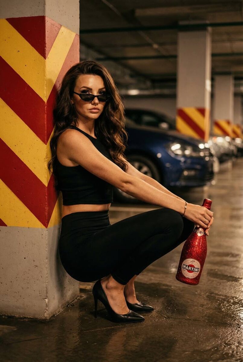 🫶 Using the uploaded reference photo, keep facial features, bone structure, skin tone 100% identical to the original. Do not change face shape, identity or expression; preserve realistic skin texture and pores, avoiding plastic smoothing. Maintain natural proportions. Composition & Pose Vertical portrait framing from feet to slightly above the head. The subject is crouching on the floor of an underground parking garage, sitting on her heels with both knees bent. Her back and left shoulder lean lightly against a concrete pillar marked with diagonal red and yellow safety stripes. Both elbows rest on her knees. Her right arm extends downward holding a red glitter-covered Martini bottle by the neck, the bottle resting on the wet concrete floor beside her foot. Her head tilts slightly forward and sideways while she looks toward the camera through narrow sunglasses. Expression confident and slightly serious. Camera & Lens Camera positioned low near ground level at roughly knee height, an