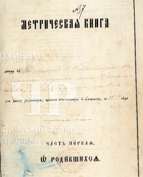 Село Сотниково. Метрическая книга о бракосочетавшихся за 1865-1896 гг. ГИА Чувашской Республики (ГИА ЧР), фонд № 557, опись № 8, дело № 148, стр. 248 скан. Метрическая книга, данная из Казанской Духовной Консистории во Введенскую церковь села Сотникова Чебоксарского уезда, для записки родившихся, браком сочетавшихся и умерших на 1879 год. Часть вторая. О бракосочетавшихся. Стр. 254 скан. Июль. № 21. 6 числа. Жених: Села Сотникова околодка Арзаматова из чуваш крестьянина Василия Никитина сын Гордий Васильев, православного вероисповедания, первым браком. 27 лет. Невеста: Ольга Феодорова, села Сотникова околодка Арзаматова из чуваш крестьянина Феодора Львова дочь, православного вероисповедания, девица. 24 лет. Поручители по женихе: села Сотникова околодка Арзаматова из чуваш крестьяне Стефан Яковлев, Моисей Васильев. По невесте: села Сотникова из чуваш крестьяне Диомид Иванов и Аверкий Петров. Таинство венчания совершил священник Константин Львов Левитский. Диакон Константин Димитриев Руб