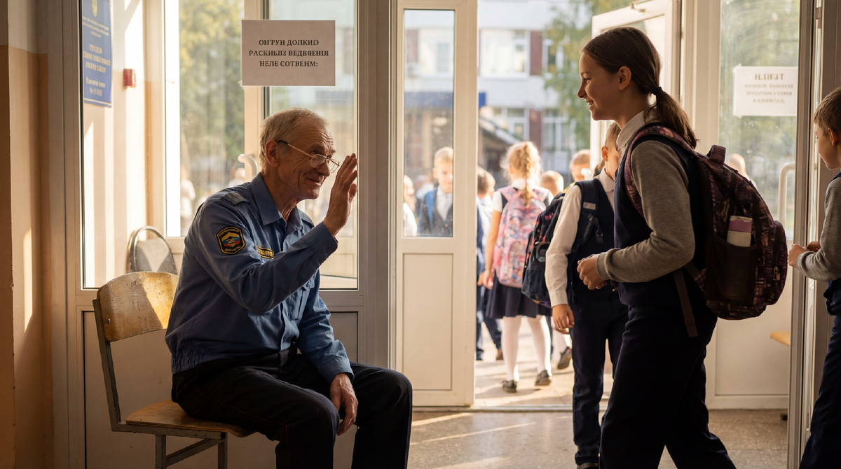 Его звали Михаил Григорьевич. Просто — охранник в школе номер сто двадцать три, в Ленинском районе Новосибирска. Невысокий, худой, в синей форменной куртке с надписью «Охрана» на спине. Седые виски, тихий голос, глаза за старомодными очками. Из тех людей, которых проходишь мимо и не замечаешь. Он сидел на стуле у входа с семи утра до семи вечера. Каждый день, кроме воскресенья. Проверял пропуска, кивал учителям, провожал взглядом детей. И ещё он делал одну странную вещь. Каждое утро, когда дети проходили мимо, он говорил каждому: — Доброе утро, Ваня! — Доброе утро, Маша! — Доброе утро, Саша! По имени. Каждого. Всех четыреста двадцать учеников школы — по имени. Дети удивлялись, учителя посмеивались, директор не обращала внимания. Ну, здоровается человек. Чудак. Настя Коваленко ходила в эту школу с пятого по одиннадцатый класс. Тихая, худенькая девочка с тёмными кругами под глазами и рюкзаком, который был ей велик. Садилась за последнюю парту. Не поднимала руку. Не ходила на дискотеки. Д