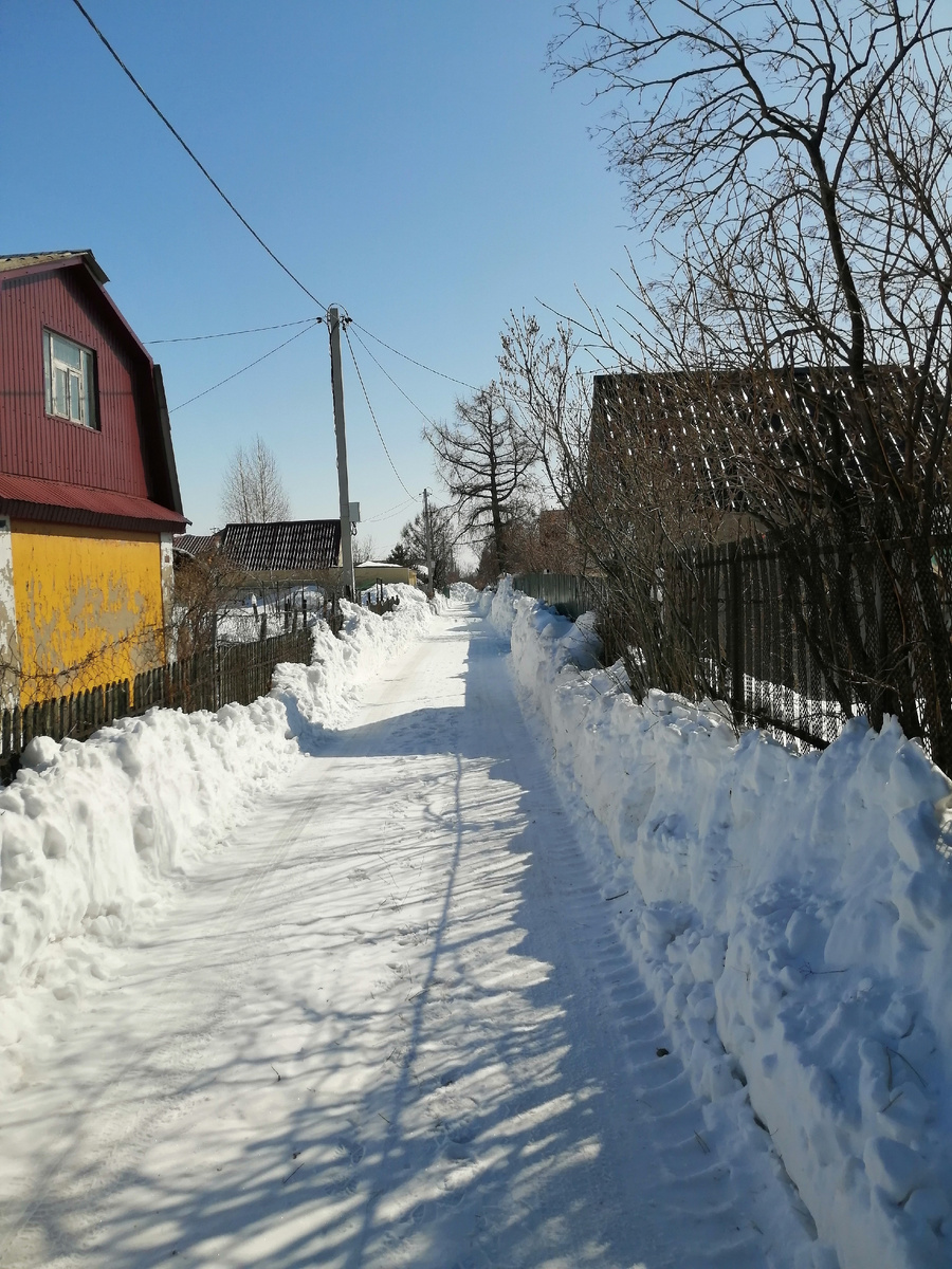 Даже не в сад, я просто до калитки) Потому что в садоводстве второй год чистят снег. И вот лучше бы они этого не делали. Потому что у нас не коттеджный поселок и не деревня, где ширина улиц все же на это рассчитана. У нас очень старое садоводство. Улицы узкие, и как результат этой очистки - вот такие вот валы вдоль заборов: Вдалеке видно кучу, которую трактор нагреб дальше по улице - поперек всего: Интересно, а те, у кого участки дальше, как должны туда попадать через этот холм - перепрыгивать или перелетать?.. Нам калитку завалили до половины, соседям забор и ворота еще выше: И это придется откапывать, у нас калитки смотрят на север, само не растает. Ну, по крайней мере, понятно, что можно высвистывать сына и ехать. Заодно через забор пригляделась к уровню снега и степени его таяния. И знаете, во-первых, около кедра уже вполне себе оттаяло: То есть как обычно первыми у меня выйдут из-под снега верески. Хорошо, что они закиданы хвоей и еще прикрыты сверху, не погорят. Одна из бочек х