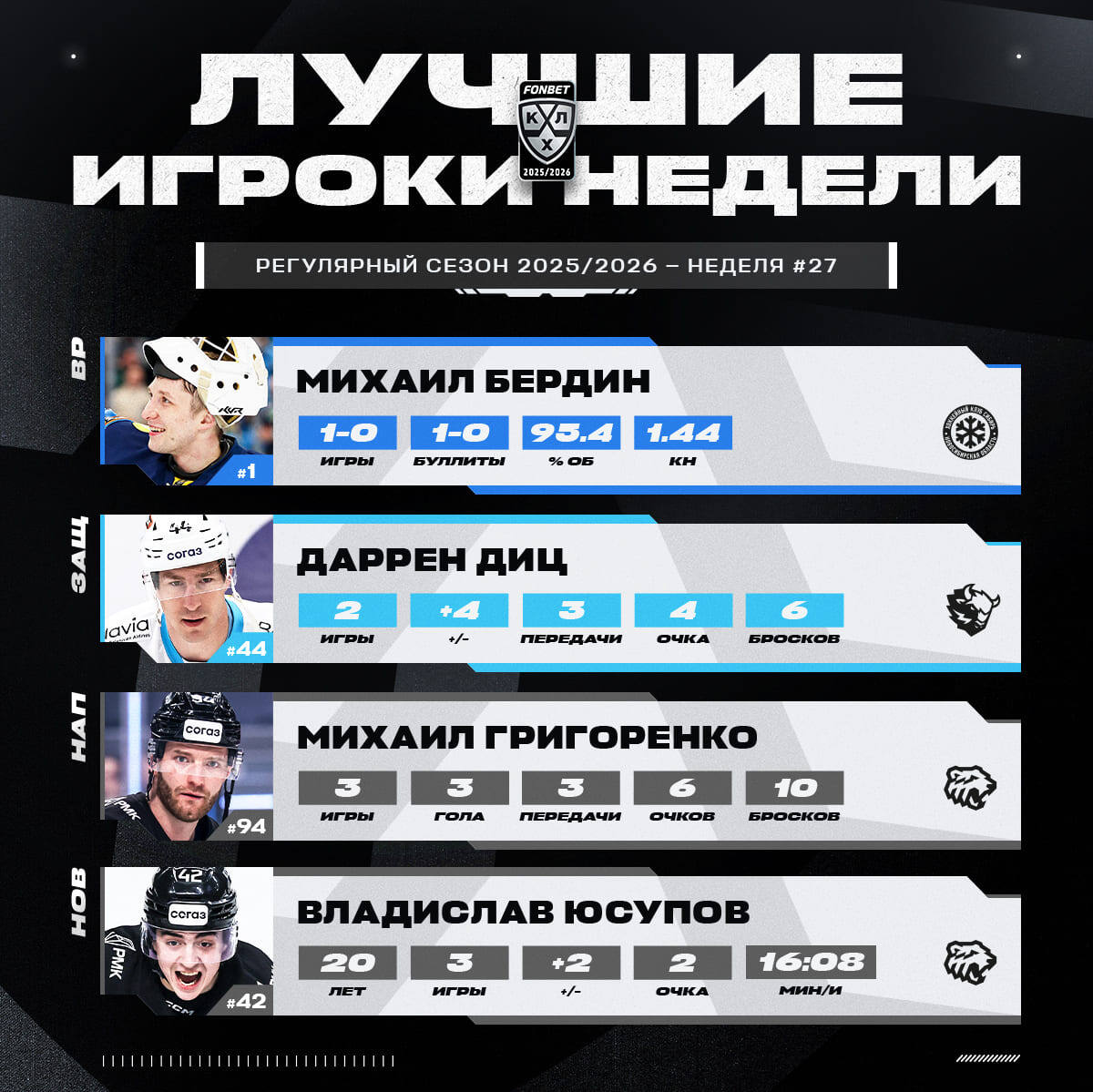 КХЛ определила лучших игроков 27-й недели сезона 2025/2026