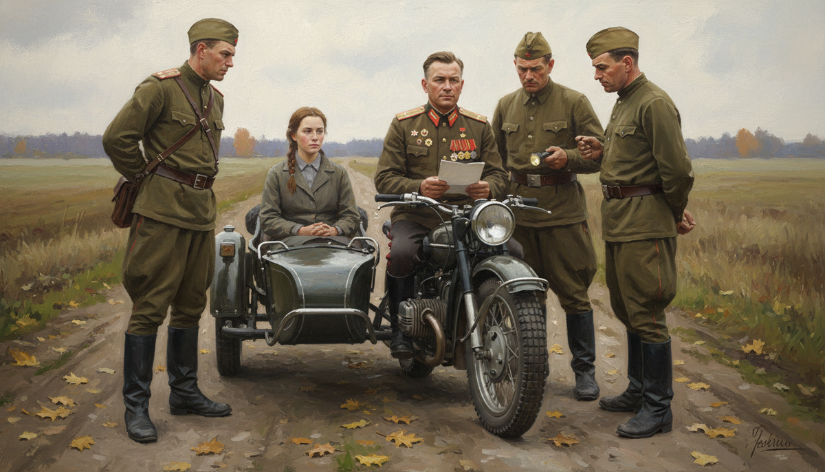 Офицеры контрразведки останавливают мотоцикл с коляской. В коляске — молодая женщина. За рулём — мужчина в форме майора. На груди — звезда Героя Советского Союза и орден Ленина. Документы безупречны. Газеты с его портретом — настоящие. Перед ними — живой герой войны.