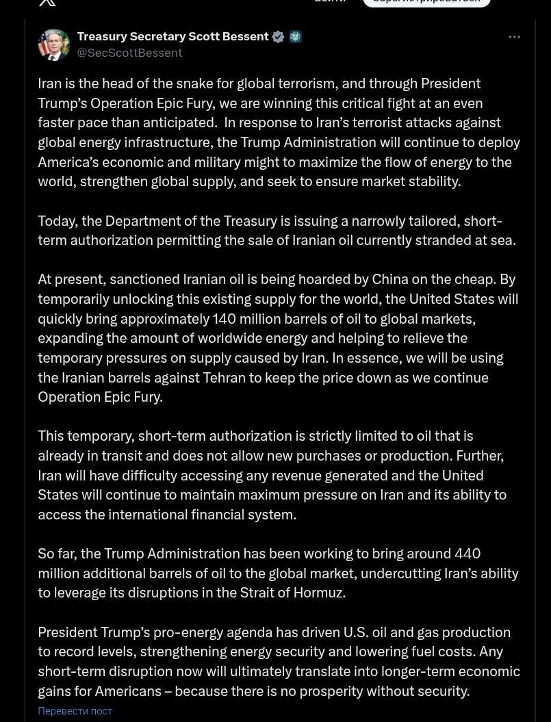 По словам главы ведомства Бессента, речь идет о 30-дневном разрешении, которое касается уже добытых объемов и не допускает новых поставок или увеличения добычи. Это нужно, чтоб сдержать рост цен на нефть из-за нынешней войны в Иране. ➖"Временно разблокируя этот уже существующий объём для мирового рынка, США быстро выведут на рынок около 140 миллионов баррелей нефти, увеличив глобальное предложение и ослабив краткосрочное давление на поставки", - заявил он. Дядька Гарри. Подпишись! https://max.ru/UnknownWitnessTV