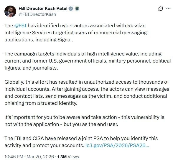 ❗️FBI director Patel claims Russian CYBER SPIES hijacking American chat apps