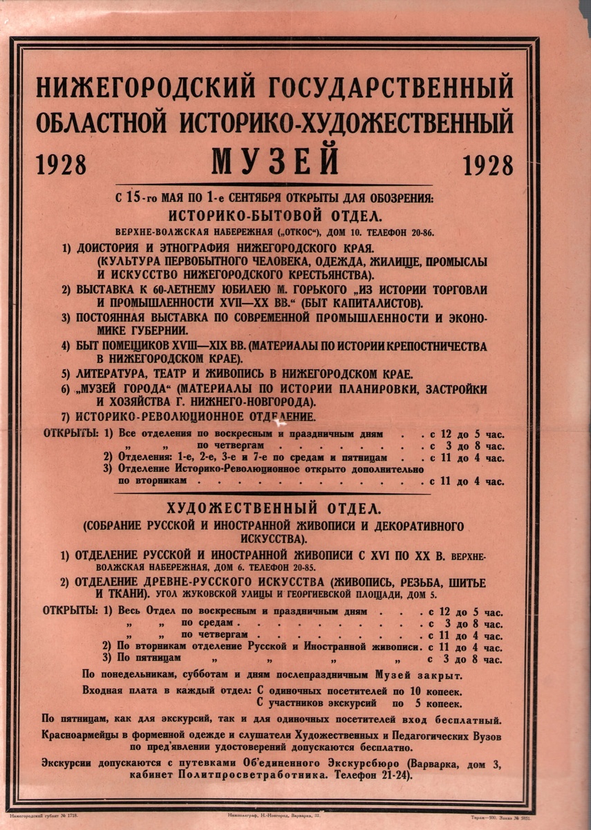 Взгляните на этот уникальный документ — афишу Нижегородского государственного областного историко-художественного музея за 1928 год. Почти 100 лет назад музей уже был крупным культурным центром. Он состоял из двух больших отделов: Историко-бытового (на Верхне-Волжской набережной, д. 10) и Художественного. Интересно, что Художественный отдел размещался в двух зданиях: коллекции русской и иностранной живописи с XVI по XX век находились в доме № 6 на Верхне-Волжской набережной, а отделение древне-русского искусства с живописью, резьбой и тканями — на углу Жуковской улицы и Георгиевской площади, в доме № 5. Помимо выставочных залов, музей располагал тремя научно-вспомогательными учреждениями. ⚪️ Библиотека была открыта для всех, кто занимался историей, краеведением и искусством. ⚪️ Фотолаборатория обслуживала не только музейные нужды: здесь фотографировали коллекции, памятники старины и помогали научным экспедициям в полевых работах. ⚪️ Особой гордостью была реставрационная мастерская. Под