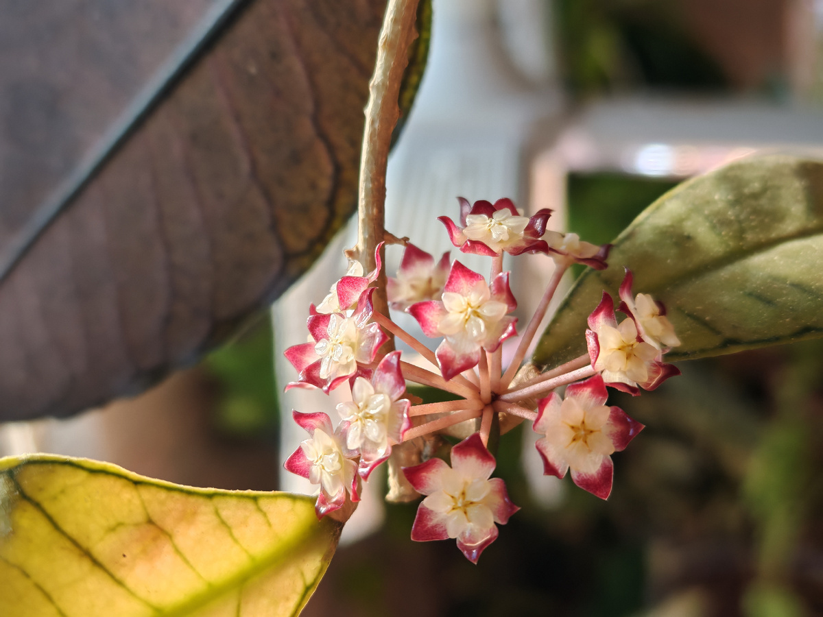 Это моё самое любимое в этой хойе — её умение загорать. Все краски осени, собранные на одном растении! Когда она стояла под лампами, загара не было — лампы давали достаточно света для роста, но не для окраса. Сейчас она у меня в компромиссном месте: юго-восточное окно на небольшом расстоянии, с полупрозрачным притенением. Думаю, ей будет в самый раз, и я наконец смогу в полной мере любоваться её загаром.