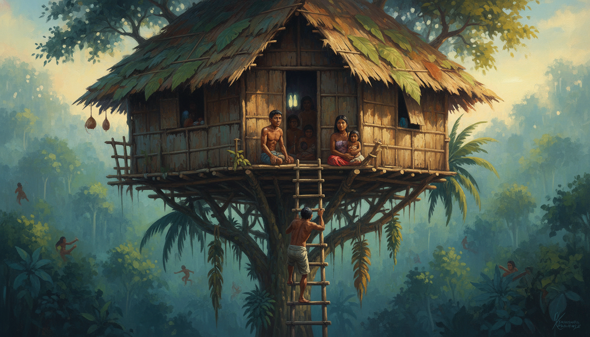 Они жили так тысячи лет. И понятия не имели, что на свете вообще есть кто-то ещё. До 1978 года короваи были уверены: они — единственные люди на этой земле. Вокруг только лес, духи и небо. И вдруг из джунглей вышел нидерландский миссионер Иоганнес Фелдхёйзен. Для короваев это был не контакт с цивилизацией. Это было явление чего-то непонятного и, скорее всего, потустороннего. Примерно 3000–4000 человек. Столько их живёт сегодня в непролазных лесах провинции Южный Папуа — на западной половине острова Новая Гвинея, принадлежащей Индонезии. Места, куда вертолёт не залетает, а интернет и вовсе не слышал. И вот что интересно: эти люди давно решили главный архитектурный вопрос своего существования. Не строить на земле вообще. Дома короваев стоят на деревьях. Обычные — на высоте 8–15 метров. Самые впечатляющие — на 40–45 метрах над землёй. Это примерно высота пятнадцатиэтажного дома. Без лифта, без строительных лесов, без гвоздей и уровня. Строят они всё это каменными и костяными орудиями. Вру