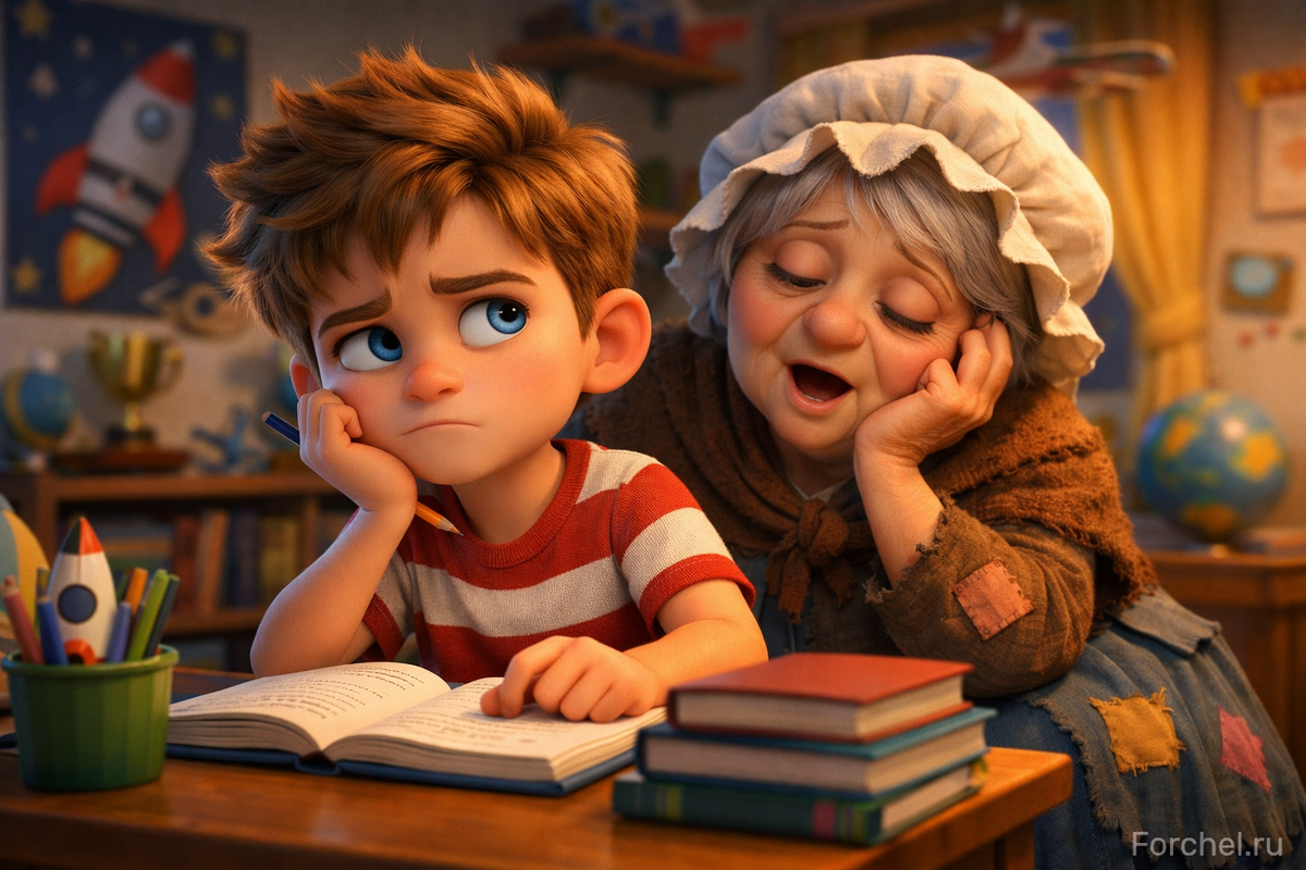 Жил-был мальчик Петя. Был он смышленым, любил играть и мечтать о больших успехах. Только одно было неладно: стоило ему сесть за уроки или взяться за книгу — сразу появлялась странная дама в чепчике и латаной юбке.