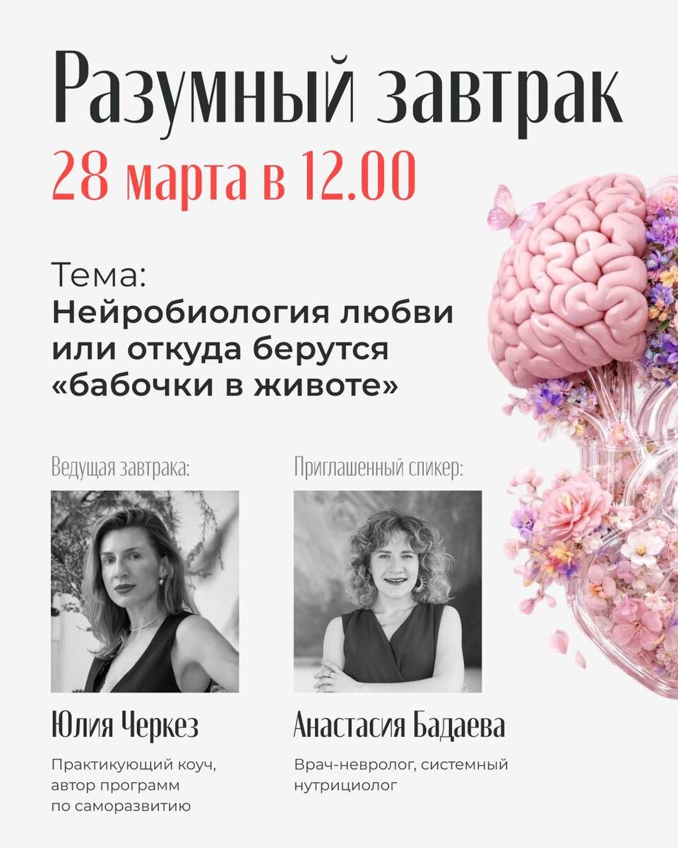 🩷 Друзья, ура) Идея совместить ЛЮБОВЬ и НАУКУ вылилась в прекрасную тему завтрака: «Нейробиология любви, или откуда берутся бабочки в животе?» Это будет не просто разговор о чувствах. Это путешествие в то, как любовь живёт в теле — как она меняет наше восприятие, влияет на решения и напрямую определяет качество жизни. На встрече разберёмся: 🦋Как мозг создаёт чувство влюблённости 🦋Почему это состояние физиологически похоже на стресс 🦋Как взаимодействуют эмоции, дофамин и адреналин 🦋Что происходит с телом, когда «бабочки в животе» 🦋Можно ли управлять этим состоянием — и нужно ли Приглашённый спикер — Анастасия Бадаева, врач-невролог, руководитель Института нейродинамики и прикладного анализа, ассистент кафедры патологической физиологии Сеченовского университета, системный нутрициолог с британской квалификацией. Это будет разговор на стыке науки, тела и чувств. Про любовь — без мистики, но с настоящим восхищением тем, как гениально устроен наш организм. 🌟Когда: 28 марта, су